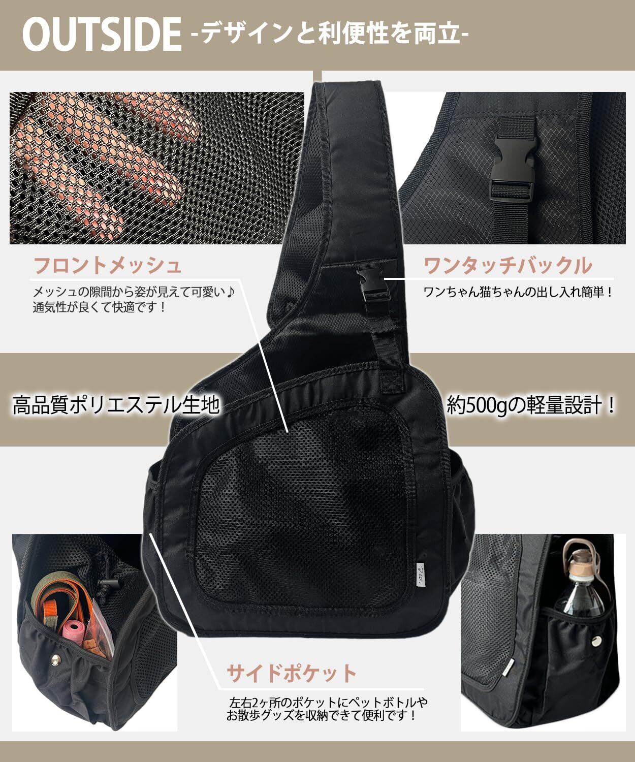 ✅【機能性】ペットの出し入れが簡単なワンタッチバックル式、飛び出し防止リード、ペットボトルやスマホの収納に便利なサイドポケット付き。